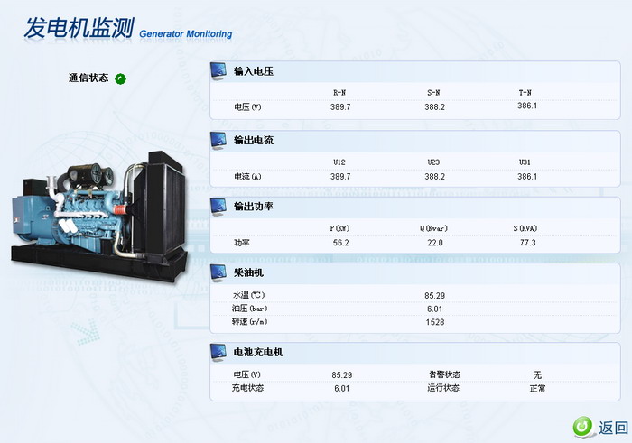 6、柴油發電機組:監測發電機組運行狀態以及輸出電壓、電流、頻率、水溫、油位、油壓等參數,控制發電機組的啟停。